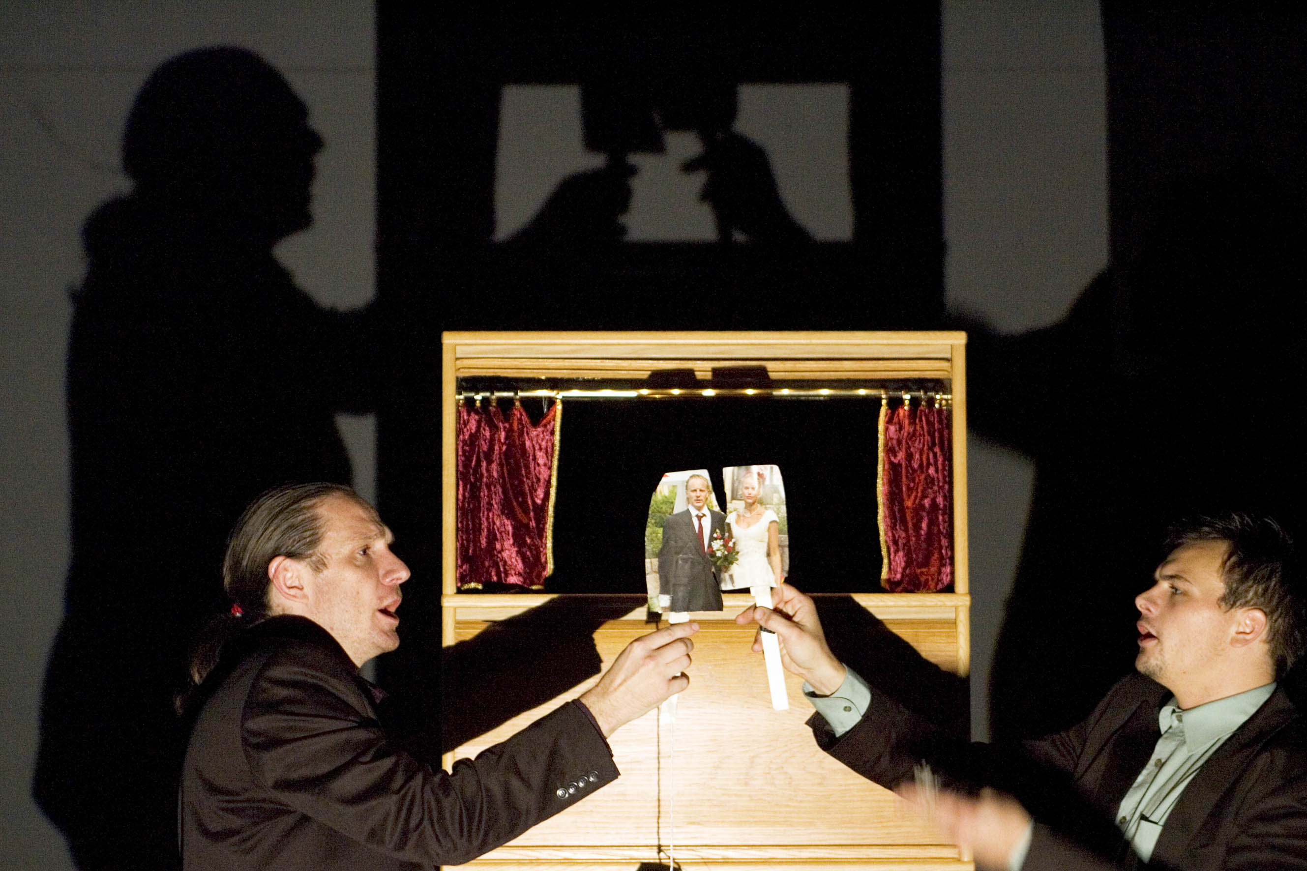 Motiv/bildtext: Föreställningen Mariamne av Pär Lagerkvist, regi Andreas Boonstra. På bild: Pontus Stenshäll & Mathias Olsson, pappdockorna är Andreas Boonstra och Linda Källgren